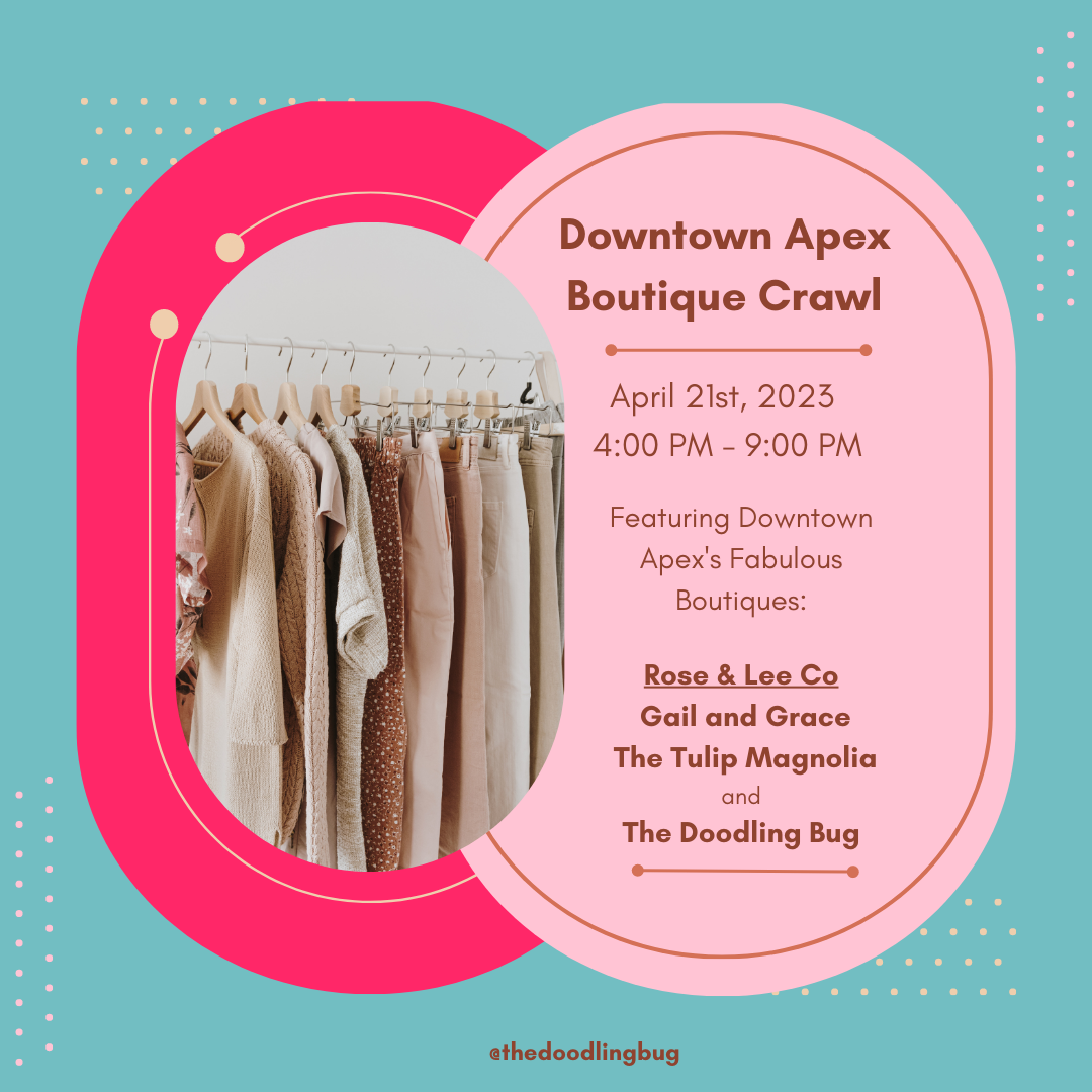 Downtown Apex's second Boutique Craw is happening April 21stl! Grab your besties and save the date for a Boutique Crawl! Join us for a fun night of shopping downtown Apex!